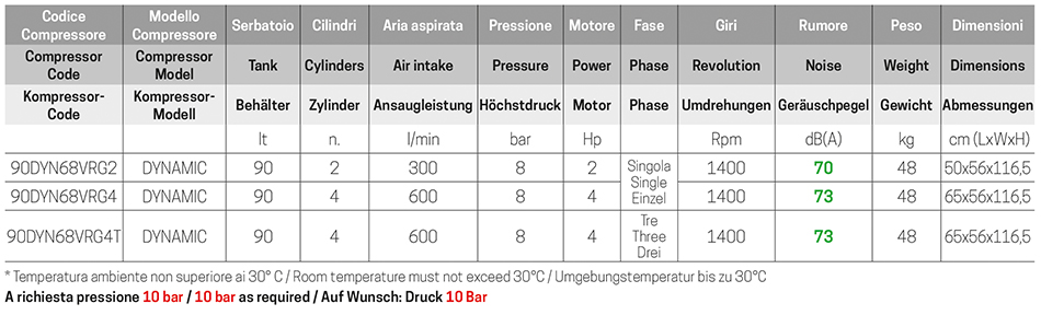 DYNAMIC 90 L is a robust compressor for professional use. It has a sizeable tank and provides large reserves of air. Suitable for using on utensils that require an elevated use of compressed air.